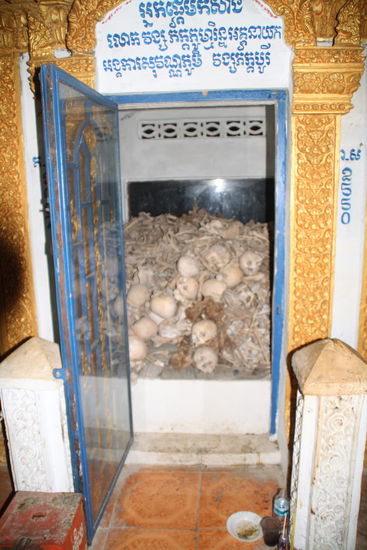 Die Laster donnerten nur so an uns vorbei, wodurch wir eigentlich permanent in einer Staubwolke fuhren. Aber das fehlte ja noch in unserer Liste, also nahmen wir es mit abenteuerlustigem Humor. Entsprechend eingestaubt trafen wir also unterhalb des Tempelberges ein, wo wir uns gleich in die Obhut eines Führers begaben. Dieser war ein buddhistischer Student - kannte sich aber auch sehr gut mit der Geschichte der Roten Khmer aus, die an diesem Ort auch ihr Unwesen getrieben haben. Das angebotene Moped zum Gipfel lehnten wir selbstverständlich ab - schließlich war 12 Uhr mittags gerade erst vorbei und richtig geschwitzt hatten wir ja heute auch noch nicht...! Also marschierten wir die außerordentlich steile Straße hoch, und oben angekommen waren wir endlich wieder komplett durchgeschwitzt - alles richtig gemacht...! Unsere erste Station hatte es gleich richtig in sich...die Pagode (also quasi ein Gotteshaus), vor der wir standen, diente damals den Roten Khmer als Foltergefängnis. Die "Geständigen" wurden dann ein paar Meter weiter in einer Höhle zu Tode gestürzt, und wenn sie nicht sofort tot waren, krepierten sie inmitten eines stinkenden Leichenberges...!