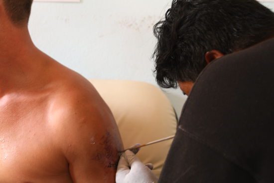 Dann hatte Sandra ein großes Verlangen nach einer Hornhautentfernung an den Füßen...nun ja - jedem das Seine, und während sie ihre Sohlen in Säure hielt, guckte ich im Internet noch mal dem Rechten. Mit Füßen weich wie ein Babyarsch machten Sandra und ich uns auf den Weg zum Kae Beah- Beach - zum Tätowierladen unseres Vertrauens...! Hier schlug meine große Stunde, denn ich ließ mir im Bamboo- Verfahren ein buddhistisches Schutztattoo auf den linken oberen Arm stechen. Ich hab geschwitzt, wie ein Eisbär in der Sahara und weh getan, hat es auch ziemlich dolle.