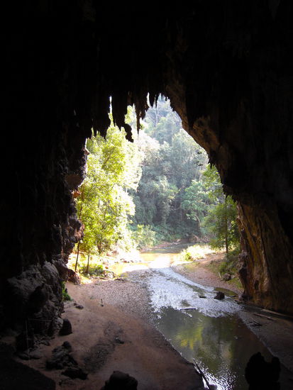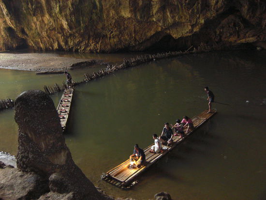 Weiter ging die Reise zu den 30 km entfernten Tham Lot Höhlen. Diese waren touristisch auch voll erschlossen. Eine kleine verhutzelte, dreizahnige alte Thaifrau wurde uns - inkl. Karbidlampe - zur Seite gestellt. Mit ihr bestiegen wir ein Bambusfloß, das auf einem seichten Fluss in die Höhle hinein glitt.