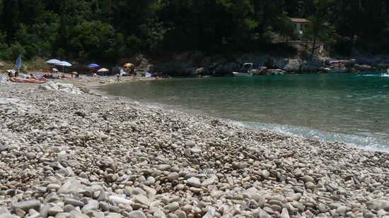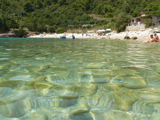 Direkt an der Hauptstraße unterhalb einer einfachen aber anscheinend beliebten Appartementanlage liegt dieser kleine Kieselstrand mit Tauchstation, Kanu Verleih, Restaurant und Süßwasserdusche.