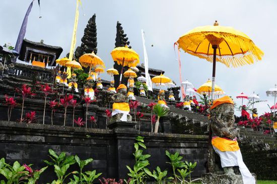 Einen Ausflugstag haben wir aber doch noch eingelegt, wieder mit Fahrer und Privatauto. Die Tour ging, an Reisterrassen und -feldern vorbei, Richtung Mt. Agung, dem über 3.100 m hohen Vulkanberg der Insel. Auf einer Höhe von ca. 1000 m liegt der größte Tempel Balis, Besakih. Diese Tempelanlage ist die wichtigste Wallfahrtsstätte der balinesischen Hindus.