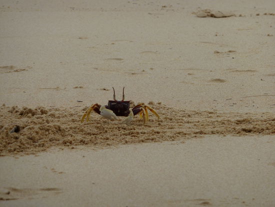 Beim Erkunden haben Hannake und ich diesen lustigen Kerl entdeckt. So einen ordentlichen Krebs hatten wir beide noch nicht gesehen. Nach der Fertigstellung seines Hauses hat er erst draussen aufgeraeumt und dann auch noch alles mit seinen Scheren planiert, wir haben uns totgelacht!!!