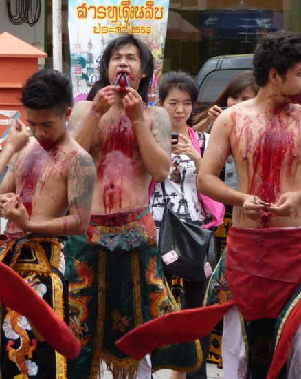 Ueberall sind Altaere aufgebaut und sie bleiben auf der Strasse sitzen und schneiden sich die Zunge auf oder saegen mit einer Saege auf der Zunge rum - spooky.....