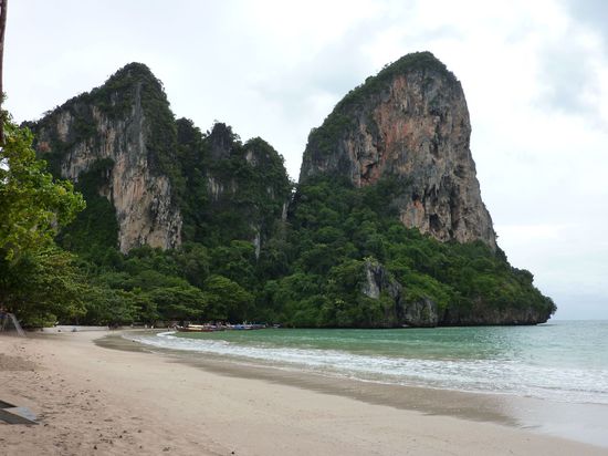 Weiter geht's. Auf nach Railey. Hier wird geklettert, ich allerdings nicht, da meine Schulter noch nervt und ich die lieber fuers Tauchen behalten will. Und es hat durchgehend gepisst, was das Klettern auch nicht einfacher macht. Ich hab Basejumper getroffen, die einen Tag vorher die KL-Towers (Kuala Lumpur) runtergesprungen sind und das dann hier auch tun wollten. Hoffe, es hat auch geklappt, sie mussten eine 10 Meter hohe Steilwand hoch ohne jegliche Sicherung. Letztes Jahr ist einer abgeschmiert...
