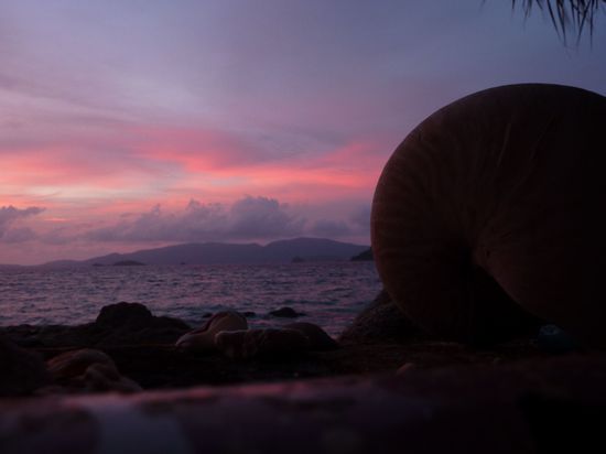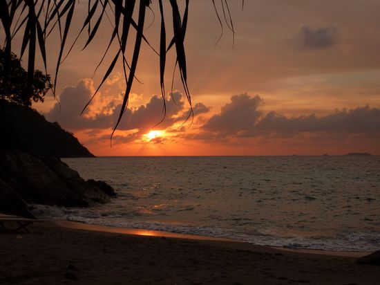 Ich hab erst auf der Sunset-Seite gewohnt und bin dann noch fuer eine Nacht auf die "tuerkise Seite" gezogen, wo ich nur fuer mich den weissen Strand und das herrliche Wasser geniessen wollte (ich hatte das ganze Resort fuer mich). Haette auch fast geklappt, ploetzlich war hinter meinem Bungalow naemlich eine fette Party. Gestern war naemlich der Beginn der Saison und das feiern die Seezigeuner, die dort wohnen, indem sie ihrem Oberguru Essen ans Grab bringen, tanzen, singen usw. Und dieses Grab war genau hinter meinem Bungalow. Nachher konzentrierte die Party sich aber auf die Ortsmitte und ich konnte ganz in Ruhe den Mond, den Strand und meine Veranda geniessen.