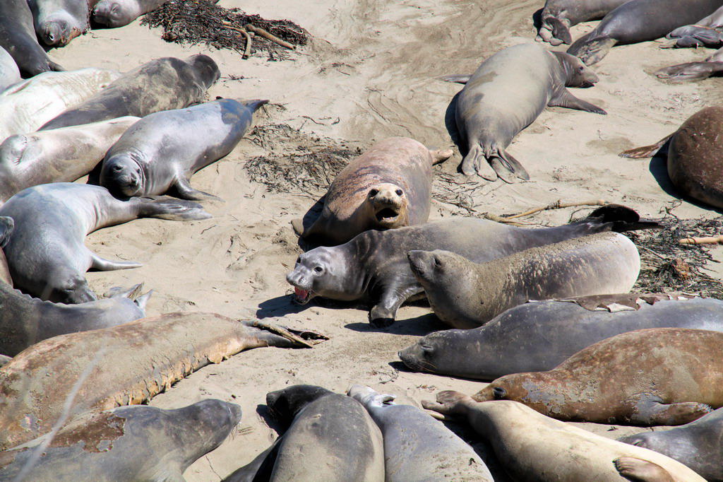 Ein paar Kilometer nördlich vom Hearst Castle (haben wir nicht besucht) konnten wir ganz viele See-Elefanten (Elephant Seals) am Strand liegen sehen. Die See-Elefanten gehören zu den größten Robbenarten der Welt.