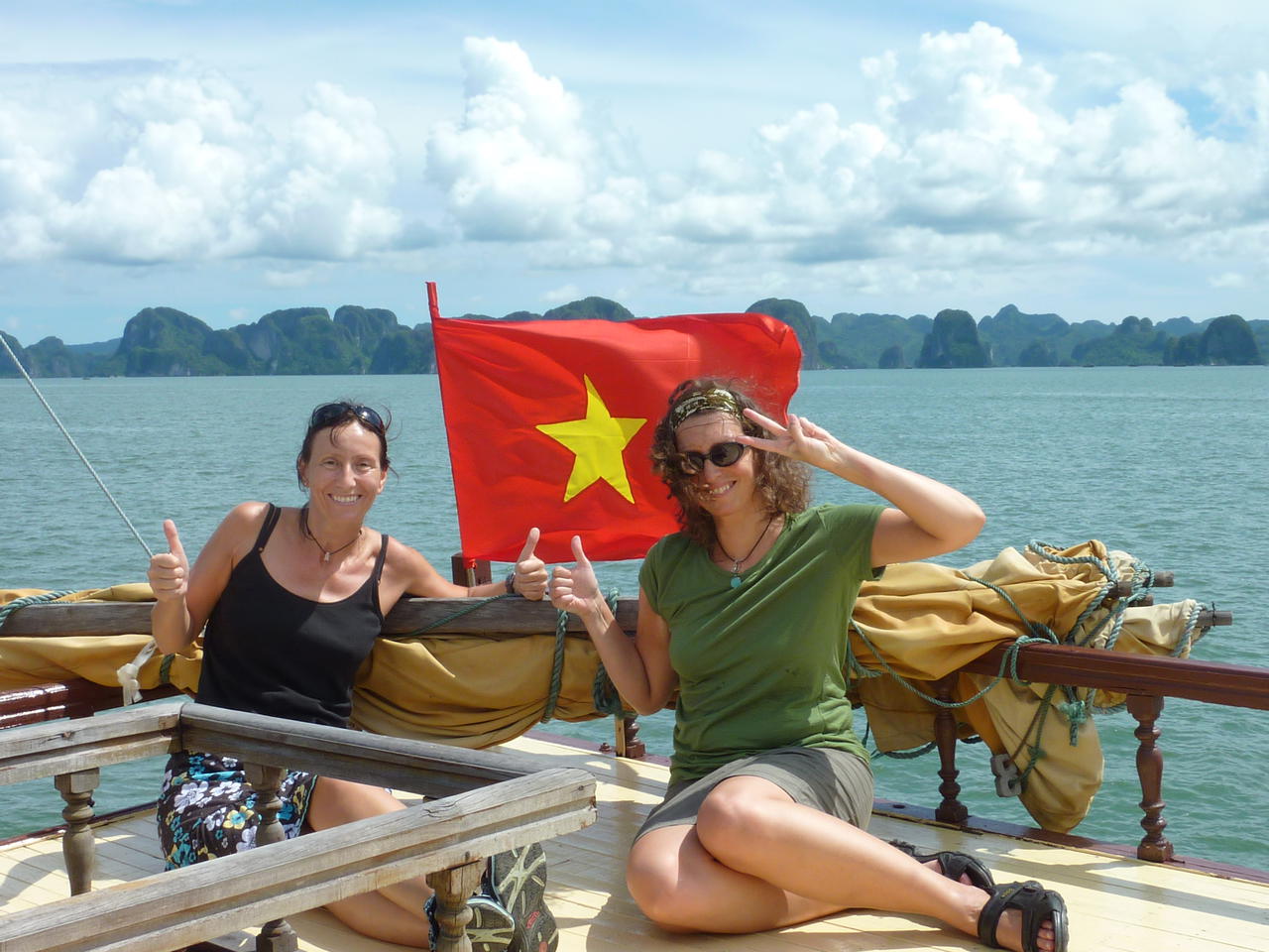 Dann ging es das letztemal auf eine Dschunke. Die hatte dann auch mal ein schoenes Oberdeck, so dass wir die Halong Bay nochmal richtig geniessen konnten. Schoooooen!!!