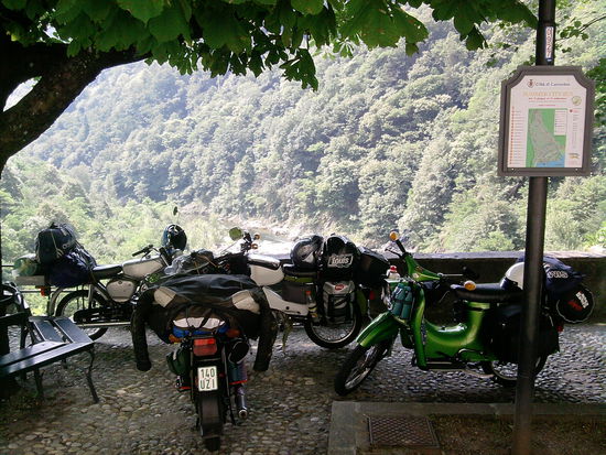 In Cannobio kannte Werner ein herrliches Ausflugsziel in einem Hochtal. Es ging zirka 10 Kilometer steil bergauf ins Hinterland. Viele Motorradfahrer waren dort unterwegs, kein Wunder, die engen Sträßchen waren ein wahres Biker Paradies. Plötzlich standen die Jungs mitten im Wald an einer Kirche. Von hier aus ging es zu Fuß bergab zu einer wunderschönen Schlucht.