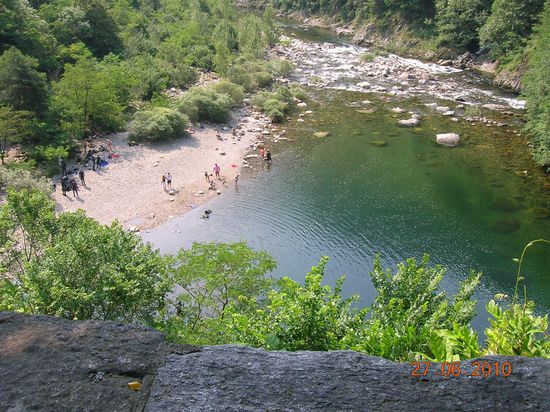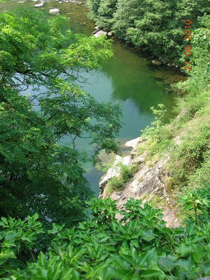 Unten erstreckte sich der glasklare und wahrhaft eiskalte Fluss in einem breiten Plateau, so dass hier ein idyllisches Badeparadies entstand. Offenbar waren hier derart tiefe Felseinschnitte vorzufinden, dass etliche Flaschentaucher hier ihrem Sport fröhnten.