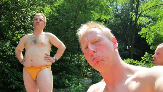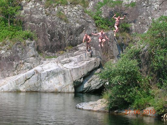 Auch die 5 Globetrotter nutzten die Gelegenheit zur Erfrischung, Rainer, Werner und Oliver setzten noch einen drauf und schwammen zu einer Klippe am anderen Ufer um mit Sprüngen aus ca. 5 Metern Höhe eine kleine Stunteinlage zu bieten.