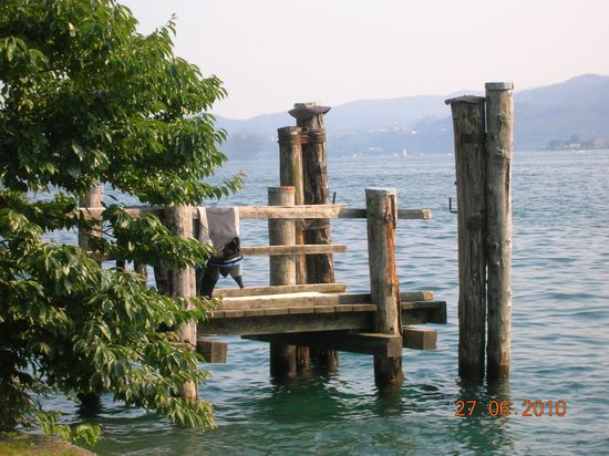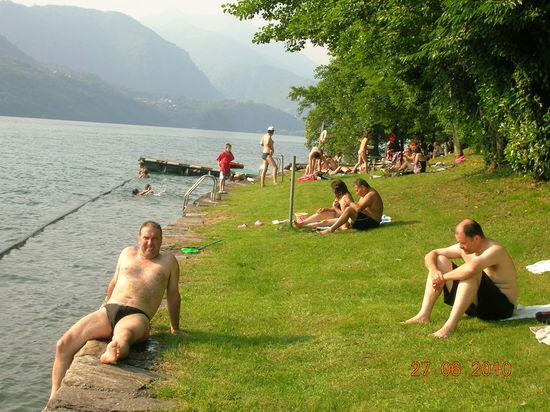 Die Ausfahrt Omegna wurde genommen und im Ort in einem Supermarkt die Vorräte aufgefüllt. Es erfolgte eine kurze Aussprache bzgl. den Ereignissen auf der Autobahn und bzgl. dem weiteren Verlauf. Bei Pettenasco wurde ein Campingplatz angefahren. Der Platz war einfach und preiswert. Leider war er nicht direkt am See, es musste die Uferstraße überquert werden. Dann aber hatte man einen für Campinggäste reservierten Strand für sich allein.