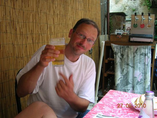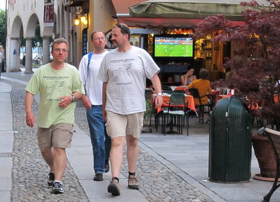 Einige Zeit später fuhren die Fünf ohne Gepäck weiter nach Orta San Giulio, quasi der touristischen Metropole und dem namensgebenden Ort am See. Auch am Abend war es immer noch unerträglich heiß. Der Ortskern ist für den Durchgangsverkehr gesperrt. Somit musste am Ortsrand auf halber Höhe geparkt werden, wie die anderen zahlreichen Touristen auch. Zu Fuß wurde ein schattiges Restaurant angesteuert. Ein großes, kühles Bier brachte die Körper wieder auf Normaltemperatur.