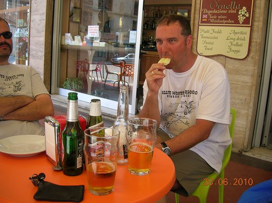 In Asti angekommen, wurde die Einkehr nachgeholt. Es war wieder extrem heiß, die Digitalanzeigen an Apotheken zeigten mitunter 40 Grad Celsius. In einer schattigen Bar gönnten sich die Tourenfahrer eine kleine Erfrischung.