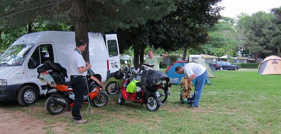 Dieser Campingplatz hatte Flair. Auf der Zeltwiese tummelten sich sowohl Familien mit Kindern, eine schweizer Gruppe Moto Cross Fahrer, junge Paare und natürlich 5 verrückte Mopedfahrer aus Deutschland auf der Durchreise ans Mittelmeer. Etwa 10 Meter von den Zelten entfernt standen die Mopeds, 10 Meter in anderer Richtung waren die gepflegten sanitären Anlagen mit großen Kühlschränken. Die Lage war ideal.