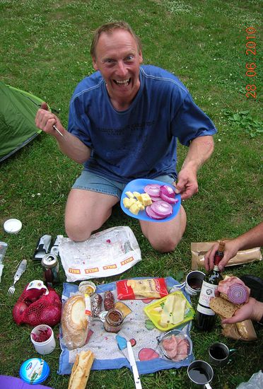 Zum Abendessen wurden zwischen den Zelten Iso Matten aneinandergelegt und alles aufgetischt, was die Vorräte hergaben. Verschiedene Brote, Aufstriche, ital. Käse und Salami, frische rote Zwiebel, Croissants, Schinken, Bier und Wein. Einfach super.