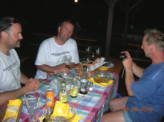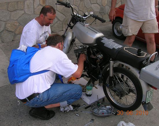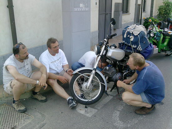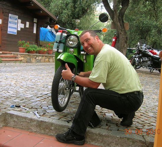 Die Erleichterung war groß, endlich den Defekt gefunden zu haben. FIAT Luigi war ein freundlicher und hilfsbereiter Geselle. Er stand den Jungs mit Rat und Tat zur Seite. Inzwischen besorgte Heiko einen sixpack Mineralwasser für alle und Rainer Eis und Pizza. Mit vereinten Kräften und Ersatzteilen war die Reparatur erfolgreich. Gegen 21:00 Uhr lief die havarierte Simson wieder mit einem Kick an. Oli war glücklich. Sein Originalzitat: "War ja eh klar, dass es daran lag, scheiß Kiste, nächstes Jahr ein Westprodukt". So ist er halt, der Oli.