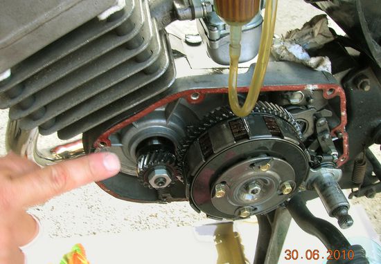 Dort wurde erst mal das Getriebeöl abgelassen. Von den ursprünglich 400 ml waren vielleicht noch knapp 200 ml vorhanden. Der Rest muss sich wohl im Laufe der Zeit über das Kurbelgehäuse verabschiedet haben. Kein Wunder, denn der Wellendichtring auf dieser Seite hängte lose auf dem Kurbelwellenstumpf, war also nicht mehr in seinem Sitz.