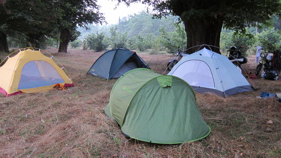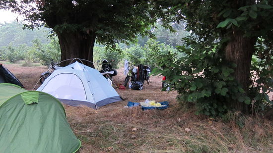 Inzwischen war es 23:00 Uhr und es musste ein Nachtlager gefunden werden. Werner hatte während der Reparatur schon mal die Fühler in diese Richtung ausgestreckt. Er führte die Gruppe zum Ortsausgang und wenig später links ab auf einen Feldweg. Es ging ca. 400 Meter durch eine Allee mit uralten, mächtigen Maronenbäumen. Auf einer Lichtung war ein wahrhaft idealer Platz gefunden, um diese Nacht zu verbringen. Die Zelte wurden errichtet und alle legten sich umgehend schlafen.