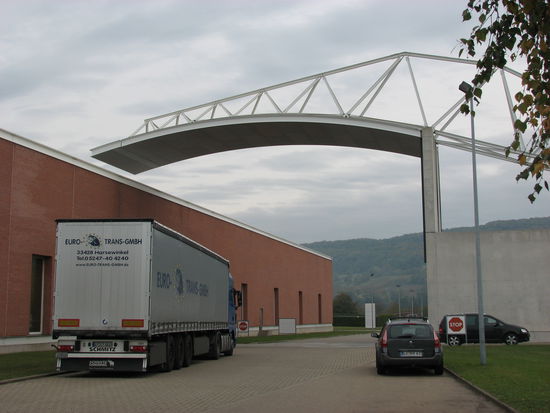Die davor erbaute Regenschutzbrücke als Verbindung zweier Werkshallen hängt als Schutz viel zu hoch, sie wurde jedoch so hoch gebaut um den Blick auf die Architektur des Feuerwehrgebäudes zu ermöglichen. Wenn es dann tatsächlich regnet wird sie an zwei Schienen herabgelassen, so dass der Gabelstablertransport geschützt ist.