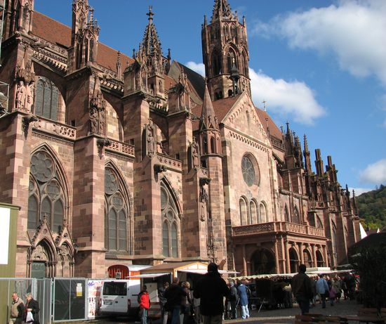 Es ist immer noch eisig kalt - daher überlegen wir gar nicht, ob wir Golf spielen wollen, sondern beschließen, heute Freiburg zu besichtigen. Die Suche nach einem Parkplatz gestaltet problematisch, so dass wir tatsächlich ins Parkhaus fahren (1,6 €/ Std). Um 10.05 ist unser Ticket gezogen. Zunächst wollen wir auf den Markt am Münsterplatz. Dort ist es recht zugig mit eisigem Wind. Trotzdem ist viel Betrieb.