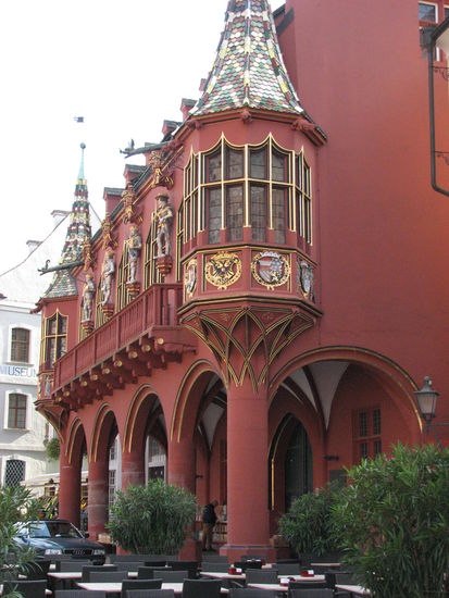 Durch die Münstergasse kommen wir dann zurück auf den Münsterplatz, der sich allmählich leert, da das Marktreiben dem Ende entgegengeht. Dadurch wird auch der Blick auf das Kornhaus freigegeben, das wohl auch einmal als Schlachthaus (Metzig) genutzt wurde. Der auffälligste Bau am Münsterplatz ist jedoch das historische Kaufhaus, das von der mittelalterliche Bedeutung des Handels für Freiburg zeugt. 1520- 30 erbaut zeigt es in den Wappen und Standbildern die Verbundenheit zum Hause Habsburg, das über 400 Jahre über Freiburg regierte.