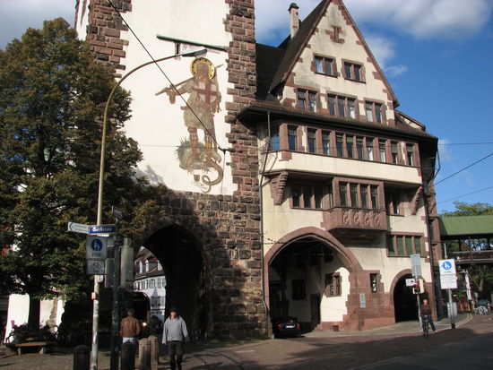 Am Schwabentor treffen wir auf den alten Salzhandelsweg, der um 1200 mit dem Tor überbaut wurde. Auf der dem Stadtinneren zugewandten Seite wurde später (16. Jh.) zur Erinnerung an die Bedeutung des Salzhandels ein Salzkaufmann aufgemalt. Die andere Seite des Turmes zeigt St. Georg den Stadtpatron von Freiburg.
