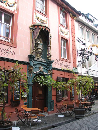 Über die Salzstrasse kehren wir in die Altstadt zurück. Vorbei am Gasthof 'zum roten Bären' , von dem überliefert ist, dass er der älteste Gasthof Deutschlands ist, da eine ununterbrochene Wirteliste seit 1387 existiert, schauen wir uns noch zwei Palais an - die Deutschordenskommende und das Sickingen-Palais (18.Jh) - die jedoch völlig zerstört nach dem Krieg mit alter Fassade neu errichtet wurden.