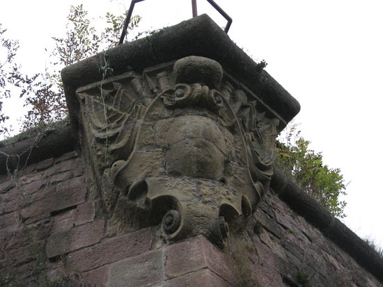 Aber es ist geschlossen, daher können wir nur die Original-Außenfront bewundern, die wie ein Wunder nie zerstört worden ist. Vor der porte liegt ein flaches altes Rheinschiff, mit dem Steine für das Fort transportiert worden sind.