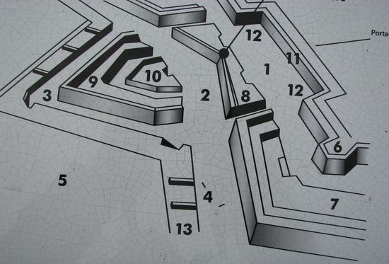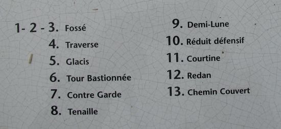 Wir steigen in den Graben hinab und laufen zunächst ein Viertel der achteckigen Stadt außen herum und betreten die Stadt durch einen 'Mauerdurchbruch - porte nicht mehr vorhanden - um bis zum riesigen Place d'armes zu laufen.