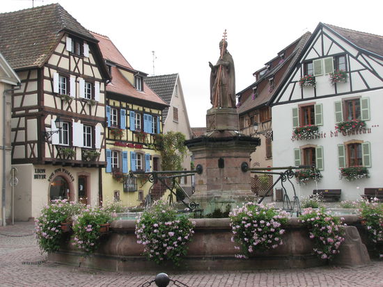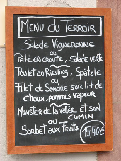 In der Auberge Alsacienne finden wir eine nettes Restaurant - der Logis de France -Kette - mit einem excellenten Menu à 15,40 €. Wir nehmen alle 6 aufgeführten Gerichte: salad de vigneronne/ paté en croute + poulet au Riesling/ sandre + Munster a sa coumin/ sorbets de fruits und teilen nach der Hälfte (je nach Geschmack).
