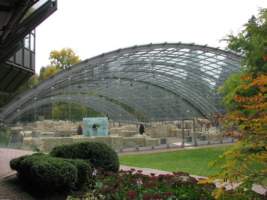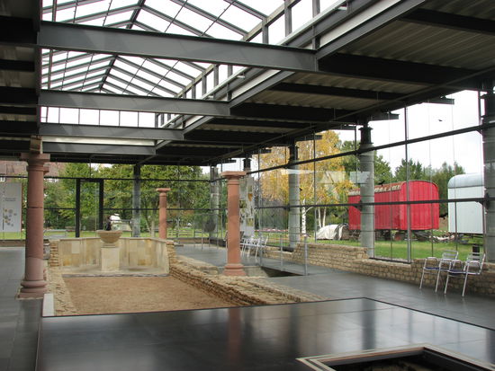 Daneben liegt das eigentliche Ziel unserer Anreise: die villa urbana - einer römischer Gutshof teilweise ausgegraben und mit Halle geschützt. Von den Funden sind einige ausgestellt und ein virtueller Rundgang wird über Beamer präsentiert - auch ein Modell ist zur Verdeutlichung aufgebaut.