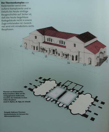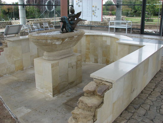 Da wir heute unseren römischen Ausgrabungstag haben , fahren wir weiter nach Badenweiler, wo wir zunächst vergeblich nach einem Parkplatz suchen und einen solchen erst wieder im Tal finden. D.h. eine absolut steile Strasse hochlaufen - unser Navi führt uns als Fußgänger direkt zur Ausgrabungsstelle des Römerbads , die wir beim Parkplatzsuchen im oberen Ortteil auch noch nicht gefunden haben. Da der Eintrittskartenautomat defekt ist, kann man heute kostenfrei besichtigen. Vergleichbar zum Areal in Ahrweiler, kann man über einen Steg oberhalb der Ausgrabung laufen und den Komplex mit 4 großen Becken und zwei runden Kaltwasserbecken ausgiebig betrachten. Die moderne Schutzhalle wirkt dabei überhaupt nicht störend.
