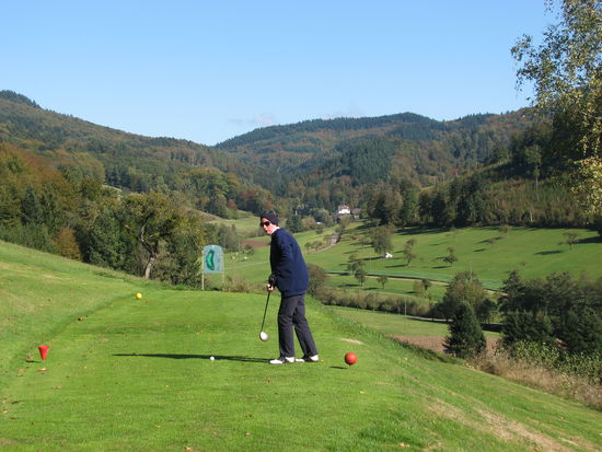 Das Auto ist voll mit Rauhreif überzogen, als wir aus dem Fenster schauen; aber der Wetterbericht sieht sonniges Wetter voraus. Daher fahren wir um 10.00 Uhr los und müssen über noch eisgefährdete Strassen zur Autobahn, die jedoch frei ist. 50 km und wir sind in Lahr - und finden in einem Seiten-Seiten-Tal den Golfplatz Ortenau - das Sekretariat hat geschlossen - wie bereits am Telefon angekündigt - und wir müssen Greenfee im Umschlag einwerfen, so dass wir fast blank sind.