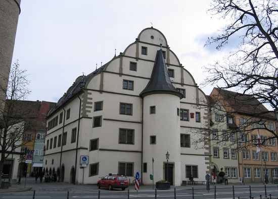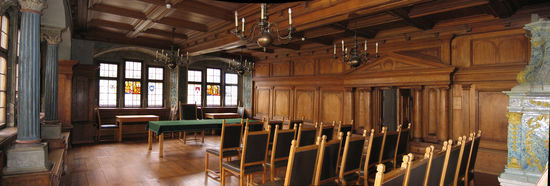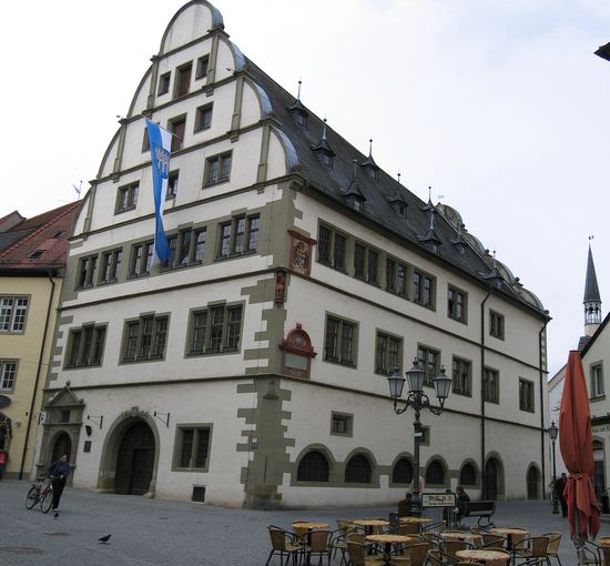 Im Stadtzentrum beginnen wir unseren Rundgang am Rathaus, das im Renaissance-Stil durch Baumeister Hans Eckart von Schaffhausen in den Jahren 1561 - 1563 erbaut wurde.