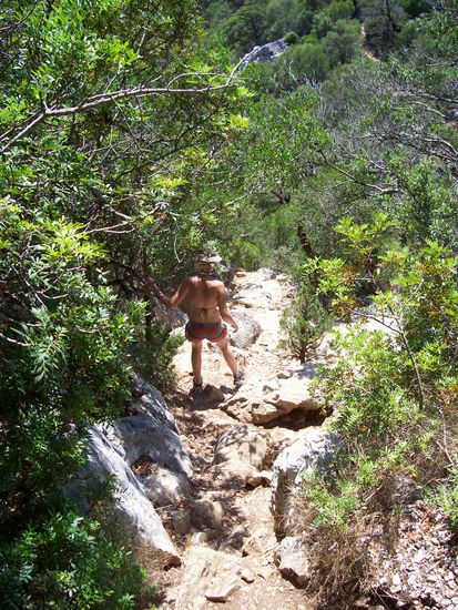 Dort angekommen - hier endet auch die Straße - kaufen wir bei einem schlitzohrigen aber netten Italiener die Tickets für die Bootsfahrt zurück nach Cala Gonone. Dieser zeigt uns noch den Wanderwegeinstieg (der Wanderführer ist hier in seinen Beschreibungen mehr als vage) und dann gehts los. Der Weg von der Cala Fuili zur Cala Luna ist ein rießen Wanderspaß, auch wenn überraschend viele Leute darauf unterwegs sind.