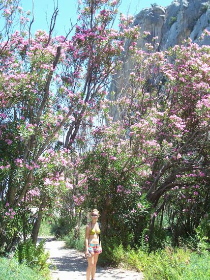 Der erste Abschnitt ist angenehm, um 10 Uhr brennt die Sonne noch nicht so heiß, es geht entlang des Strandes (der schon jetzt fast voll ist) bis zum Ende, dann durch einen fast vollständig zugewucherten Weg auf die darüber liegende Straße und dieser folgend bis zur Cala Fuili, so weit so gut.