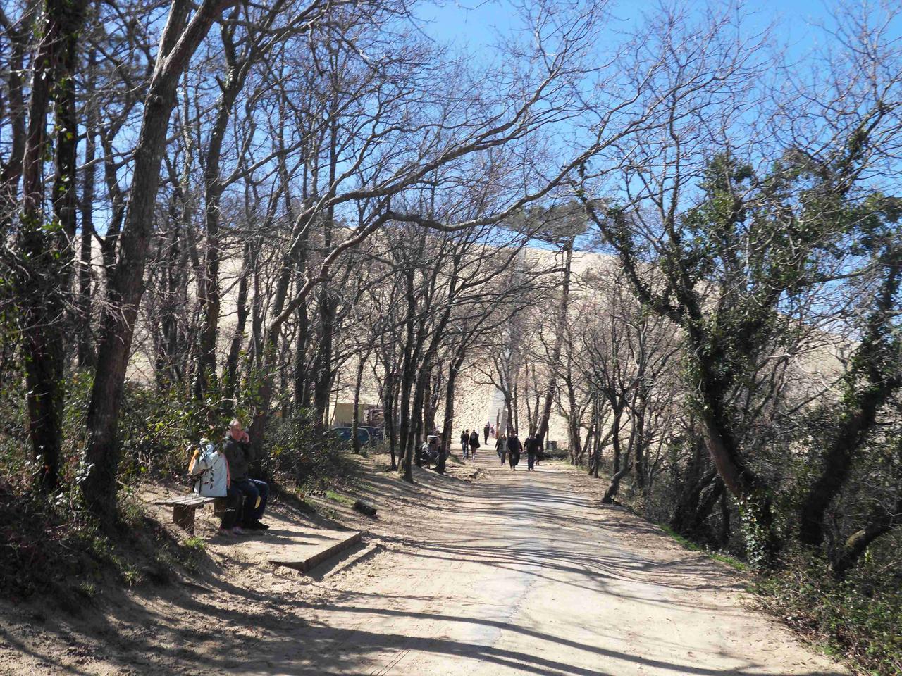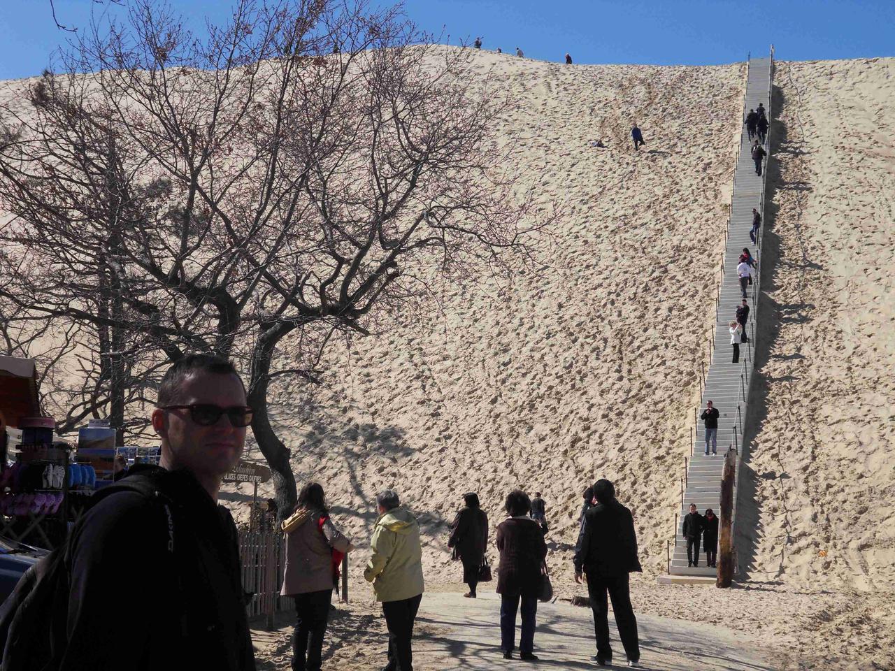 Endspurt zur Düne. Klettern durch den Wald einen Hang rauf, der geht in einen kleinen Pfad über. Der mündet dann dort, wo alle anderen Touris "zivilisiert" über einen asphaltierten Weg den Parkplatz entlang bis zur Düne gehen. Aber das ist uns zu langweilig!!!