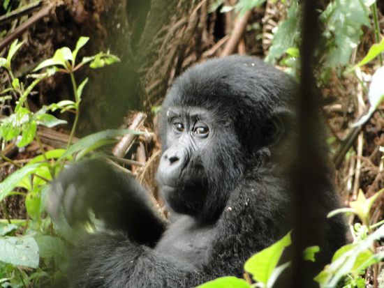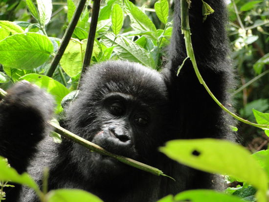 morgens um 5 uhr holte man uns ab und brachte uns auf 2500 meter über meer ins letzte mit dem auto zu befahrene dorf. von dort aus wanderten/kletterten/kriechten wir diverse hügel und berge hoch. zwei ziemlich anstrengende stunden. die guides orteten eine gruppe von gorillas im urwald unter uns. in einem ziemlich waghalsigen abstieg ging es einige hundert meter runter, teils auf dem popo, teils auf dem rücken, es war aalglatt. wir deponierten unser tagesgepäck und machten uns auf. und da waren sie!!! ein silberrücken erwartete uns zum start. danach 4 weibchen und zwei babys, eine ganze familie also. genüsslich frassen die erwachsenen, vergnüglich spielten die babys. mir stockte der atem, meine hände zitterten (kein witz, die ersten 5 minuten war ich nicht in der lage auch nur ein foto zu schiessen!) und mit tränen in den augen begutachtete ich diese tiere aus einer nähe von nur 3-5 metern. ein lang gehegter traum ging für mich in erfüllung. ganze 70 minuten verbrachten wir mit dieser familie, dann hiess es wieder abschied nehmen. der abstieg war ziemlich anstrengend, doch wir alle meisterten dies bravourös, waren wir doch in trance und noch in gedanken bei diesen wunderbaren geschöpfen. müde, aber überglücklich liessen wir die 2.5 stunden rückfahrt auf einer holperpiste über uns ergehen. ach ja, und da war noch in unserer gruppe ein norweger namens paul dabei. eingekleidet in calvin klein jeans, esprit shirt, armani jacke und hugo boss sonnenbrille plus ausgestattet mit der besten, neusten canon kamera und equipment stand er also da. immer ein lächeln in seinem gelifteten + solarium-gebrannten gesicht und parad für den shot seines lebens. leider tat er dies immer vor uns stehend und deshalb in unserer sicht. ziemlich bald wiesen wir diesen typen in die schranken und erklärten ihm, dass man anstand nicht mit geld kaufen kann. bei all seinen vorbereitungen (welche wohl normalerweise seine assistentin für ihn tätigt) vergass er essen und trinken mitzunehmen. er kriegte von uns und war auf einmal ein ziemlich netter zeitgenosse...