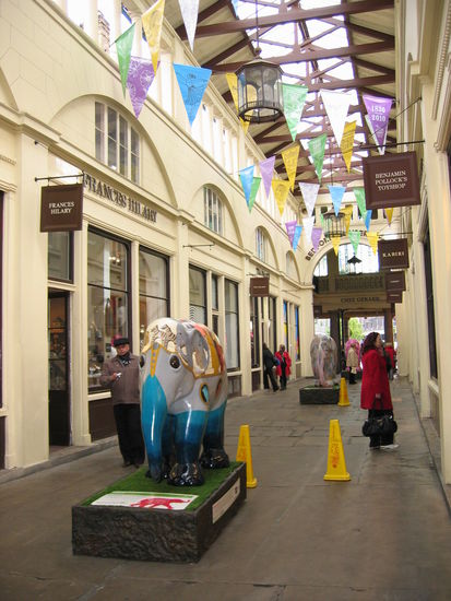 Uns fallen in den Passagen die zahlreichen Elefanten auf - bei uns in Aachen gibt es anläßlich des weltberühmten CHIO (Reit- und Springturnier) jedes Jahr die Aufstellung ähnlich aufgemachter Pferde.