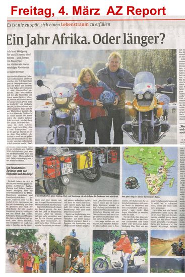 Losgehen soll es im Frühjahr 2011 für ca. 1 Jahr durch AFRIKA! Wir sind schon in den Vorbeitungen. Aussortieren, überflüssiges "entsorgen", planen, denn wir lösen unsere Wohnung auf und lagern alles ein. Für Tipps sind wir immer offen! Also bis demnächst!