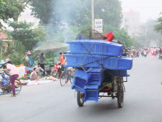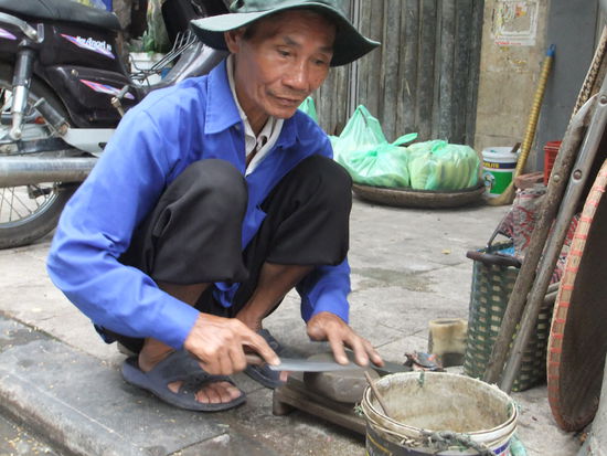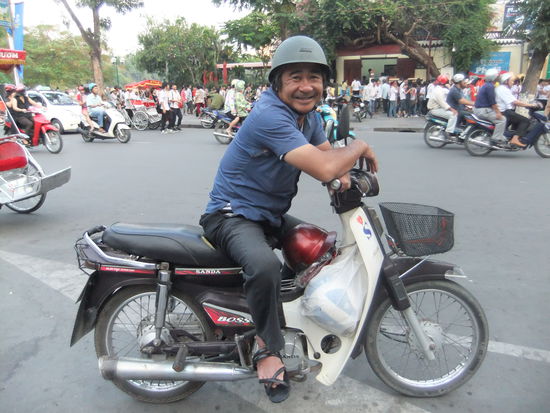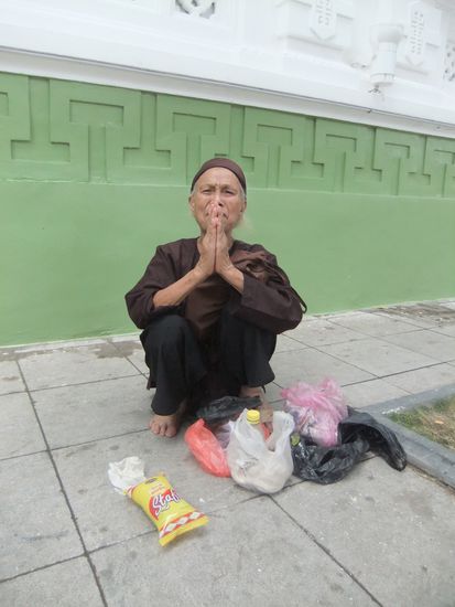 Das in diesem Gedraenge der Schweiss in stroemen laeuft, ist klar. Deshalb setze ich mich irgendwann in eine Querstrasse hin und trinke ein kaltes Bier. Neben mir sitzt ein aelterer Vietnamese, der perfekt Englisch spricht und sich als Auslandsvietnamese zu erkennen gibt, der 1975 am letzten Kriegstag mit dem Hubschrauber von der amerikanischen Botschaft in Saigon geflohen ist. Heute wohnt er in San Diego/Cal. und besucht hin und wieder seine Familie in Vietnam.