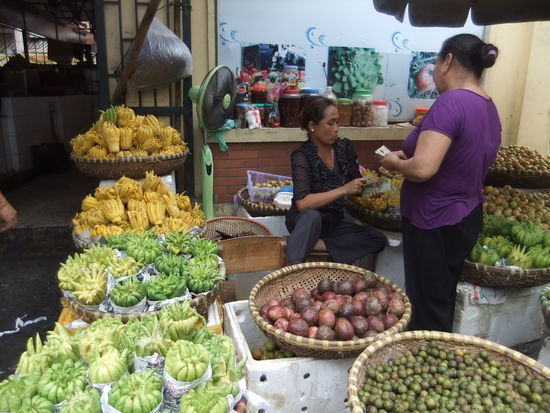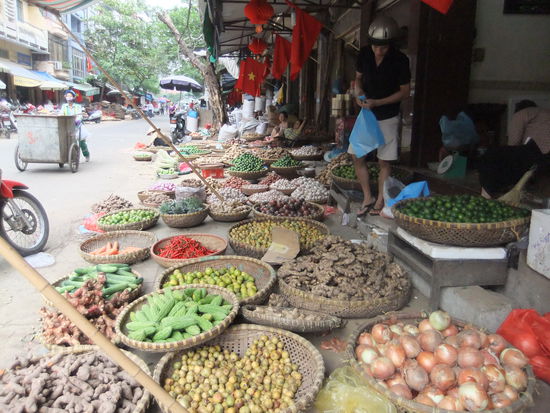 In dem Gaesschen, das kaum breiter als 2 oder 3 Meter ist, wabert der Qualm von den Grills der vielen kleinen Strassenkuechen, die hier von vegetarisch ueber Fleisch bis hin zu Seafood alles anbieten, was man sich vorstellen kann. Solche Gaesschen gibt es hier in der Altstadt zu Hauf und werden meisstens von Vietnamesen fuer ihre Mahlzeiten genutzt. Die Kuechen hier sind sehr gut und auch guenstig im Preis. Und auch wenn es manchmal etwas chaotisch aussieht, sind alle Speisen gut geniessbar, solang man sich an die 3 goldenen Regeln fuer Reisende haelt: "Cook it, peel it or forget it!"