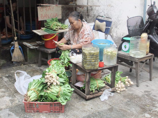 Gehandelt wird ueberall und immer mit irgendetwas. Der Hang Be Markt, der normalerweise gleich eine Strasse hinter dem See liegt und sich ueber einige Strassenzuege mit hunderten Marktstaenden erstreckt, ist fuer 3 Monate rund um die Feierlichkeiten geschlossen. Die Haendler schert das nicht, dann wird eben keine Bude aufgestellt, sondern direkt am Strassenrand mit einem etwas kleineren Sortiment am Boden gehandelt. dafuer stehen jetzt hier hunderte Mopeds von den Festbesuchern mitten auf der Strasse gegen Gebuehr.