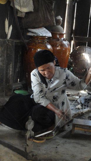 Mit dieser Maschine werden feine Seidenfaeden von dutzenden Kokons zusammengezogen und daraus wird dann ein robuster Faden.