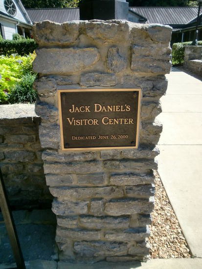 Auf dem Parkplatz angekommen, liefen wir Richtung Haupteingang. Der Bereich des Parkplatztes und des Eingangs waren mit vielen Grünflächen, Bäumen und Jack Daniel's Labels versehen und machten einen sehr gepflegten Eindruck. Das Visitor Center wurde im Jahre 2000 neu gebaut und läd rein optisch schon dazu ein, näher zu treten und sich schlau zu machen.