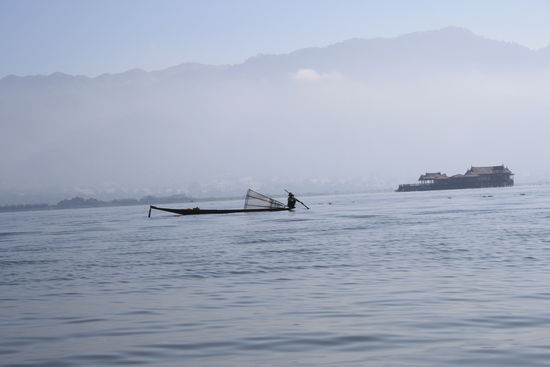 Aber vorher mußten wir Eintritt bezahlen. Auch dieses Geld wird wohl an die Regierung fließen. Dann wollten wir ein Boot mieten. Die wollten statt 15 US$ lieber 15000 Kyat. Na klar, ist ja auch mehr als 15 US$. Aber wir blieben bei unserem Angebot und die Fahrt konnte beginnen. Raus auf den See. Das Wasser war erstaunlich klar. Und Profi-Fotograph knipste ununterbrochen anstatt die Schönheit der Landschaft mal so zu genießen.