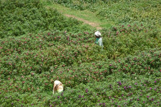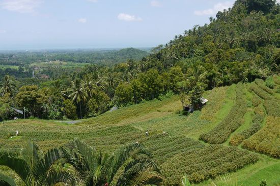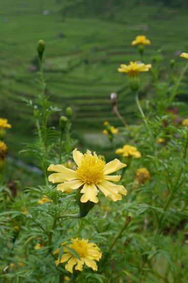 Auch heute haben wir unterwegs immer mal wieder angehalten, um weitere Fotos machen zu können. Hier sieht man Reisterrassen, die mal nicht mit Reis bepflanzt sind, sondern mit hunderten von Lieschen.