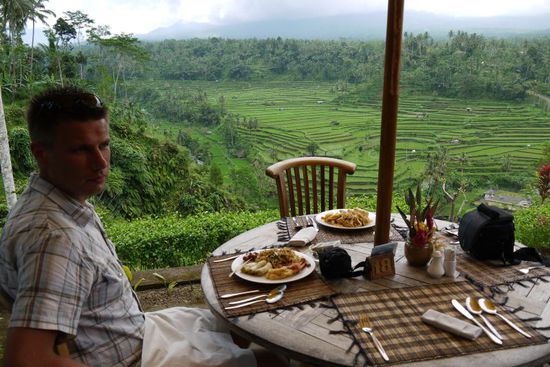 Ansonsten haben wir natürlich auch jede Menge "echter" Reisterrassen gesehen. Diese Aussicht durften wir beim Mittagessen genießen: