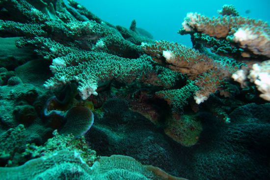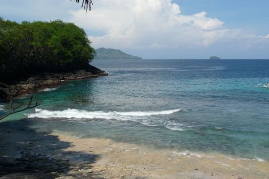 Nach gut 52 Minuten sind wir aufgetaucht und dann zum nächsten Tauchspot (Crystal Bay) gefahren, um uns dort mit Tee, Kaffee und Keksen für den nächsten Tauchgang zu stärken. In dieser Bucht war es ein wenig ruhiger, so dass wir in Ruhe unsere Getränke trinken konnten.