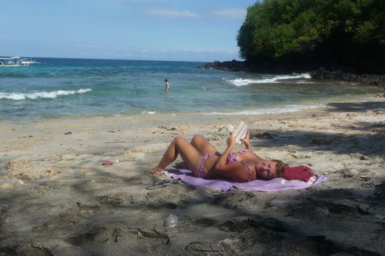 Da wir schon um 14 Uhr vom Tauchen zurück waren, haben wir den restlichen Tag genutzt, um an der Blue Lagoon zu relaxen. Diese Bucht sollte laut Reiseführer einen traumhaft schönen Strand und glasklares Wasser haben. Die Realität sieht leider anders aus. Der ganze Strand ist voller Müll und auch das Wasser lässt zu wünschen übrig. Wir haben trotzdem das beste draus gemacht und uns ein wenig gesonnt.